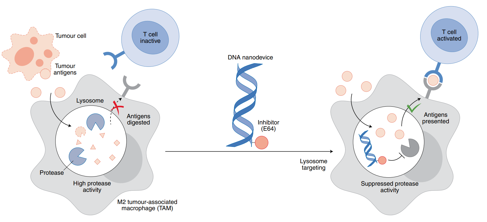树突状细胞顺利获得肿瘤抗原交叉呈递激活T淋巴细胞是肿瘤免疫治疗的一种重要途径,但树突状细胞往往缺乏深入实体瘤环境的能力。肿瘤相关巨噬细胞(TAM细胞)在肿瘤环境中丰度很高,但其抗原交叉呈递效率低。如能在活体水平对其进行靶向改造,则可望建立一种新的实体瘤免疫治疗策略。研究者发现,DNA纳米结构可以被哺乳动物细胞摄取并进入溶酶体等细胞器。而溶酶体中高活性的蛋白酶会降解TAM细胞抗原,从而导致其呈递效率低下。因此,利用DNA结构靶向细胞溶酶体的特点,可以设计装载蛋白酶抑制剂的DNA纳米器件,从而高效进入TAM细胞溶酶体并抑制其蛋白酶活性,使其中的肿瘤抗原得以保留和呈递。这一基于DNA纳米器件的思路,为激活T细胞,提升肿瘤免疫抑制能力给予了新的途径。评论指出,DNA纳米技术给予了具有近原子精度的程序化设计工具来制造纳米结构并组装成DNA器件和DNA纳米机器人,这为生物医学诊疗并带来新的变革。
