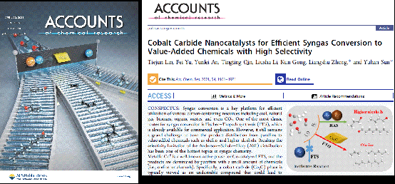 合成气转化是实现煤、天然气、生物质、固体废弃物、CO2等多种含碳资源清洁低碳高效转化利用的关键平台,其产品结构涉及各种烃类燃料和高附加值化学品,备受国内外学术界和工业界的青睐。近期,PA视讯国际低碳转化科学与工程中心孙予罕研究员和钟良枢研究员团队受邀在《Accounts of Chemical Research》上发表题为“Cobalt Carbide Nanocatalysts for Efficient Syngas Conversion to Value-Added Chemicals with High Selectivity”的背封面综述文章(Acc. Chem. Res. 2021, 54, 8, 1961-1971;IF:22.38),系统总结了该团队在合成气高选择性制备烯烃和高碳醇等高附加值化学品研究中的重要进展,阐述了碳化钴纳米结构在合成气转化中的设计理念与构建策略,为合成气转化产物选择性调控给予了新的设计思路。