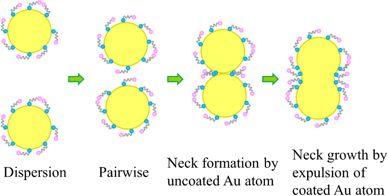 水溶液中巯基羧酸修饰的金纳米颗粒的融合生长机制示意图