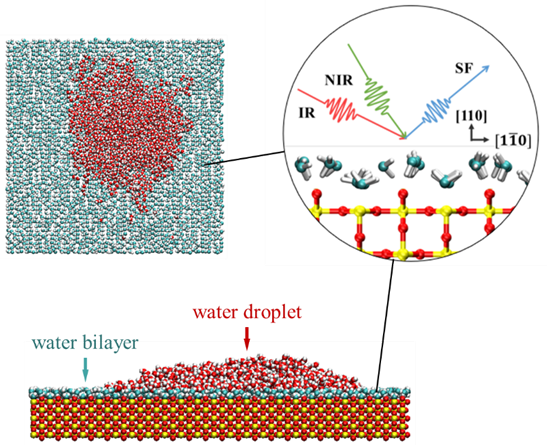 以TiO2的Rutile晶型110表面为例,顺利获得和频共振光谱实验和理论发现常温下该表面上有序双层水结构,且该有序结构导致水层上水滴存在。