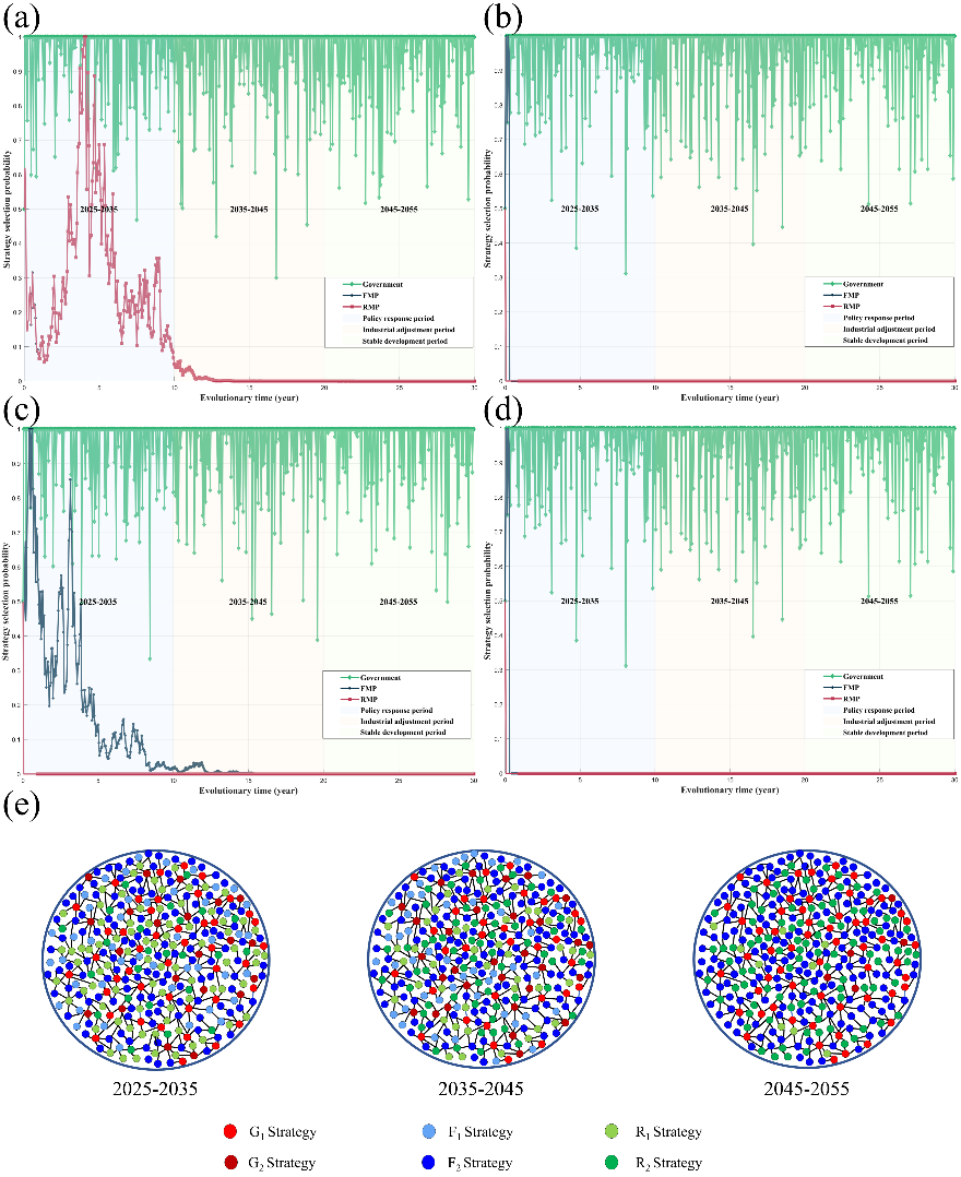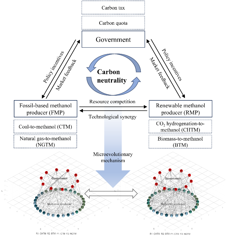 针对这一复杂问题,中国科研实验室上海高等研究院(以下简称“PA视讯国际”)“碳排放核算与碳捕集利用封存团队”提出了一种面向多主体决策的随机演化博弈精细化评估方法,系统刻画了政府、化石基甲醇生产商(FMP)与可再生甲醇生产商(RMP)之间的动态博弈关系,为甲醇产业低碳转型路径的量化分析给予了新工具。相关成果以“Methanol production technology development pathways under multi-agent stochastic evolutionary game: a complex network perspective”为题,发表于期刊《Energy》。