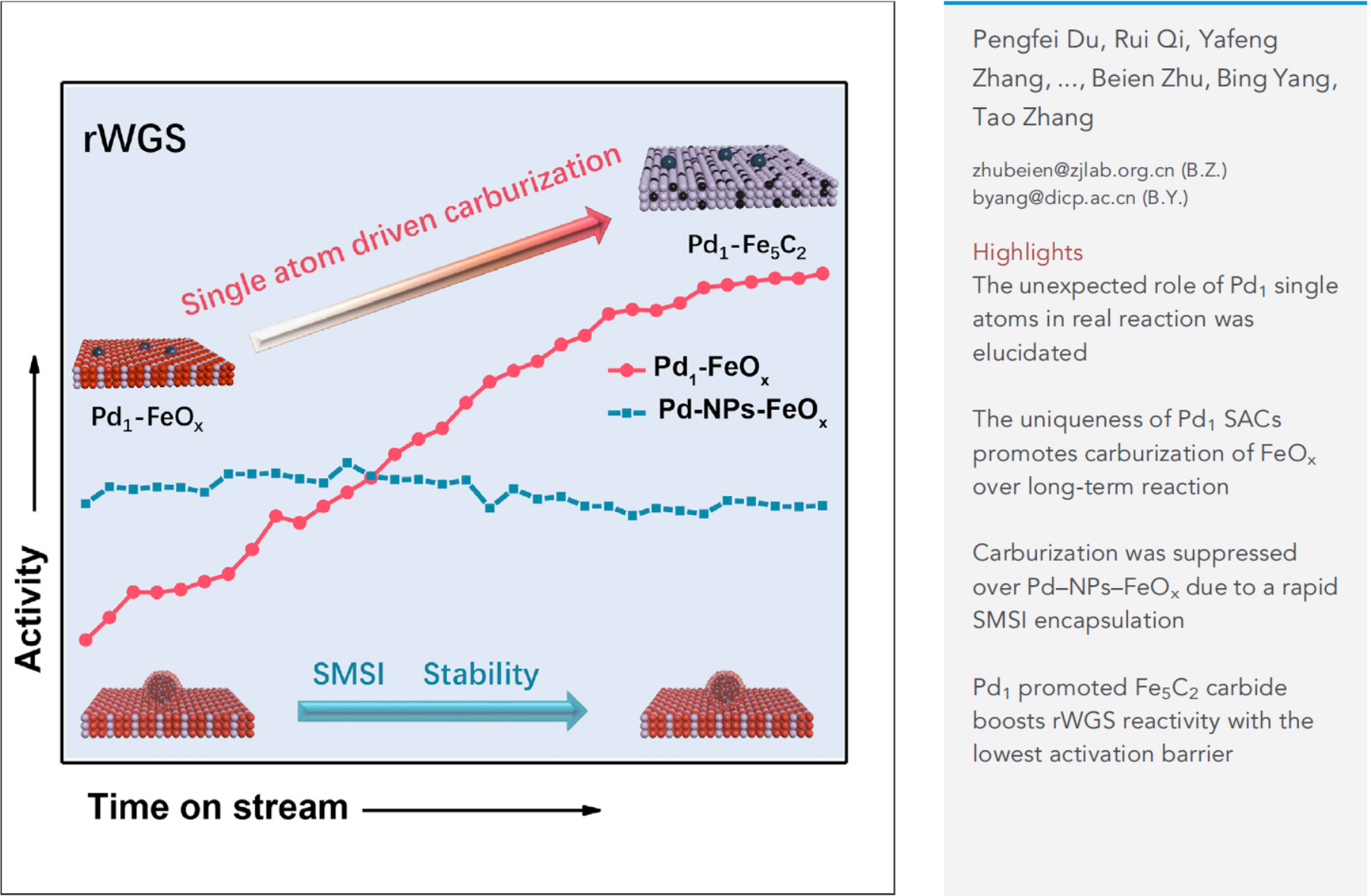 近期,中国科研实验室上海高等研究院二氧化碳光子科学建制化研究中心的朱倍恩研究员和中科院大化所张涛院士团队的杨冰副研究员合作在期刊Chem上发表了名为“Single-atom-driven dynamic carburization over Pd1–FeOx catalyst boosting CO2 conversion”的研究论文(doi.org/10.1016/j.chempr.2022.08.012)。该研究首次揭示了一种特别的金属单原子在实际反应中的双重催化作用。论文通讯作者为PA视讯国际的朱倍恩研究员和中科院大化所的杨冰副研究员,两位研究人员保有多年合作关系,此前两年的合作工作先后发表在Nature Catalysis及Nature Communications上。
